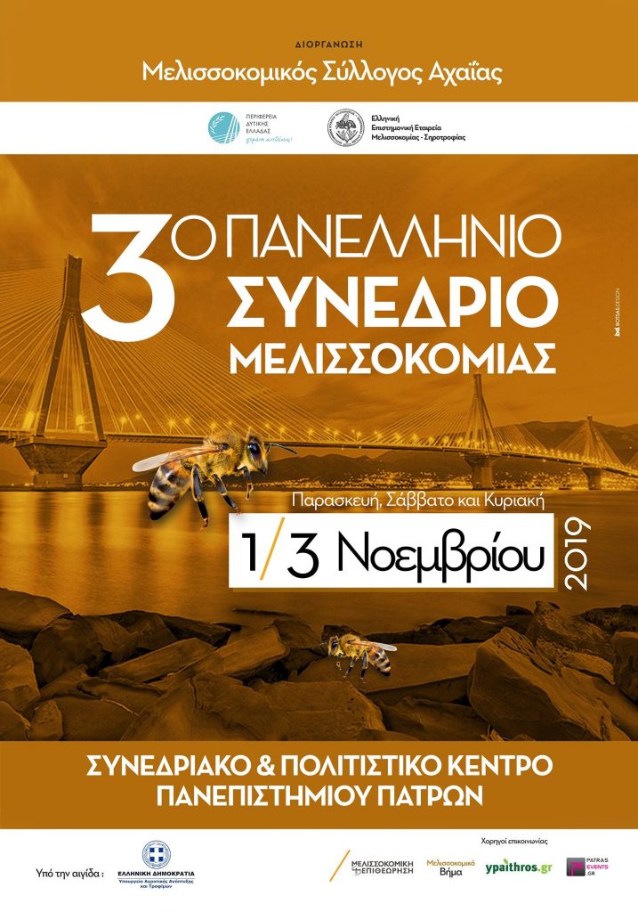 Το 3ο Πανελλήνιο Συνέδριο Επαγγελματικής Μελισσοκομίας θα πραγματοποιηθεί στην Πάτρα την Παρασκευή, Σάββατο και Κυριακή 1-3 Νοεμβρίου 2019 στο Συνεδριακό και Πολιτιστικό Κέντρο του Πανεπιστημίου Πατρών.