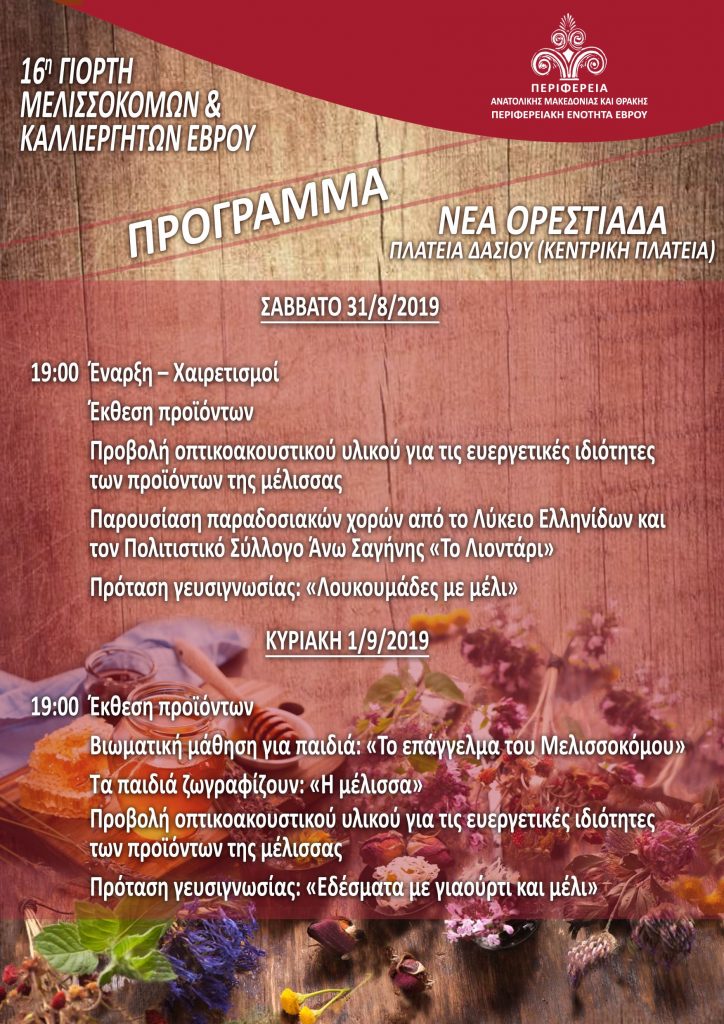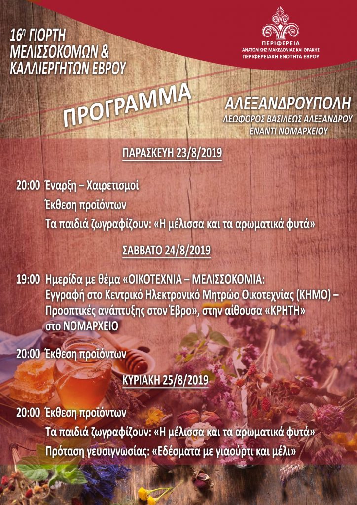 Για 16η χρονιά η Περιφέρεια Ανατολικής Μακεδονίας και Θράκης – Περιφερειακή Ενότητα Έβρου διοργανώνει τη «Γιορτή Μελισσοκόμων & Καλλιεργητών Νομού Έβρου» σε συνεργασία με Συλλόγους μελισσοκόμων και καλλιεργητών της Περιφέρειας, από την Παρασκευή 23 έως και την Κυριακή 25 Αυγούστου στην Αλεξανδρούπολη, στη Λεωφόρο Βασιλέως Αλεξάνδρου έναντι του ΝΟΜΑΡΧΕΙΟΥ, και το Σάββατο 31 Αυγούστου και την Κυριακή 1η Σεπτεμβρίου 2019, στη Νέα Ορεστιάδα, στην Πλατεία Δασίου (κεντρική πλατεία).