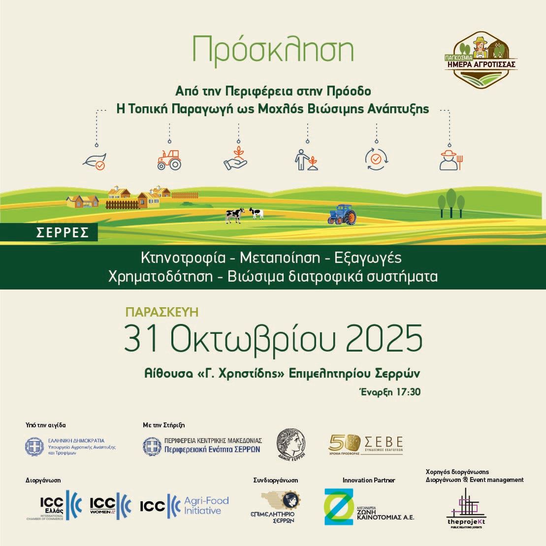 Με αφορμή την Παγκόσμια Ημέρα Αγρότισσας (15 Οκτωβρίου) και την Παγκόσμια Ημέρα Διατροφής (16 Οκτωβρίου), το ICC Hellas, ο Τομέας Αγροτικής Ανάπτυξης του ICC Hellas Women και το ICC Agri-Food Initiative Greece, σε συνδιοργάνωση με το Επιμελητήριο Σερρών, παρουσιάζουν την ετήσια εκδήλωση με τίτλο: