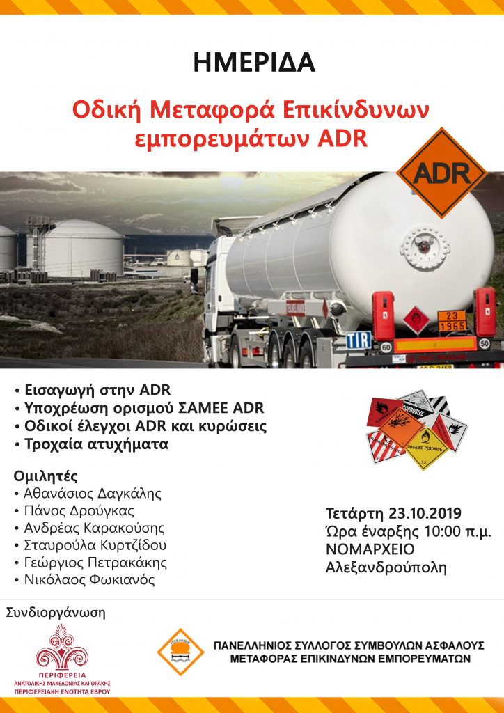 Η ασφάλεια της οδικής μεταφοράς και η διαχείριση των επικίνδυνων εμπορευμάτων είναι το θέμα της ημερίδας που διοργανώνεται από την Περιφέρεια Ανατολικής Μακεδονίας και Θράκης – Περιφερειακή Ενότητα Έβρου και τον Πανελλήνιο Σύλλογο Συμβούλων Ασφαλούς Μεταφοράς Επικίνδυνων Εμπορευμάτων με τίτλο «Οδική Μεταφορά Επικίνδυνων Εμπορευμάτων ADR» την Τετάρτη 23 Οκτωβρίου 2019 στις 10:00 π.μ. στο ΝΟΜΑΡΧΕΙΟ στην Αλεξανδρούπολη.
