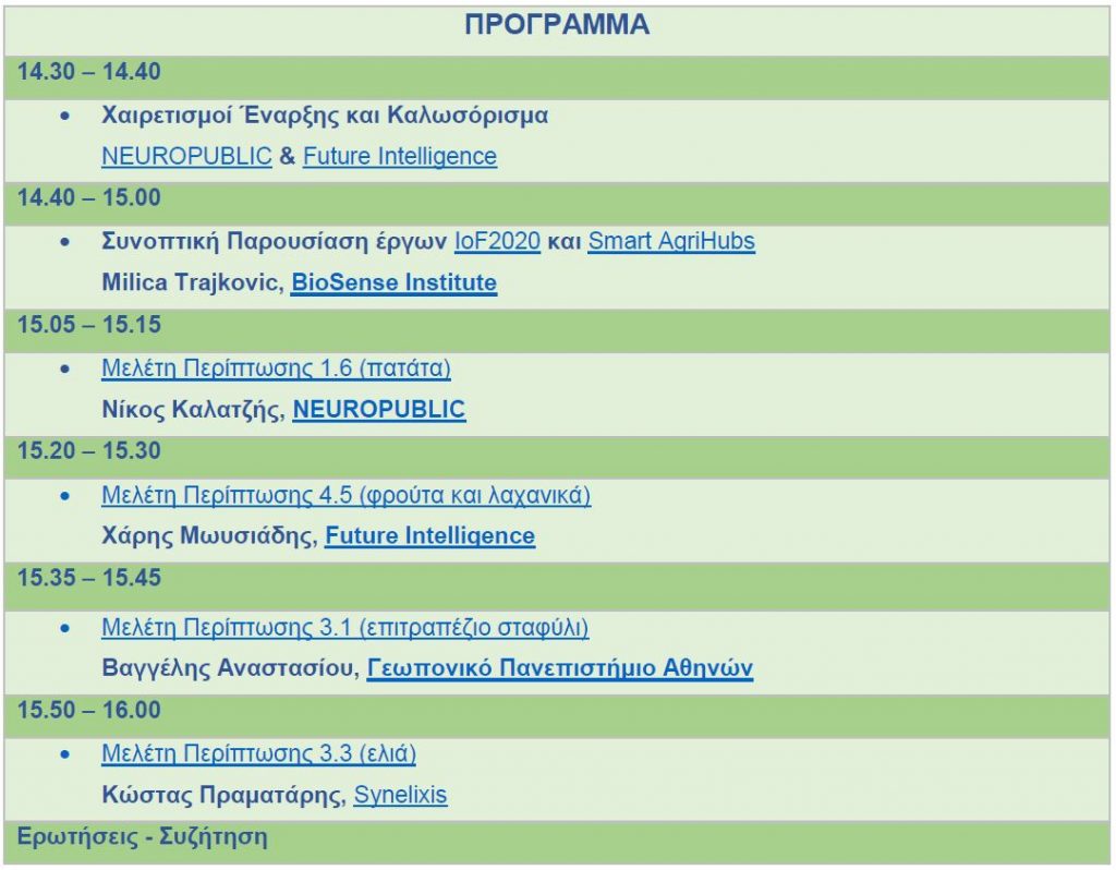 Αντικείμενο της εκδήλωσης είναι η παρουσίαση των εμπειριών και των αποτελεσμάτων των ελληνικών φορέων που συμμετείχαν στο Internet of Food & Farm 2020, το μεγαλύτερο έργο αγροδιατροφής και Διαδικτύου των Πραγμάτων (Internet of Things) στην Ευρώπη. Στο έργο συμμετείχαν τρεις ελληνικές τεχνολογικές επιχειρήσεις, μεταξύ των οποίων η NEUROPUBLIC, και ένα ερευνητικό ίδρυμα σε τρεις διαφορετικές μελέτες περιπτώσεων. Συγκεκριμένα, εξετάστηκαν οι επιπτώσεις των ΙοΤ τεχνολογιών σε φρούτα και λαχανικά, στο επιτραπέζιο σταφύλι και στην ελιά και στην καλλιέργεια της πατάτας.