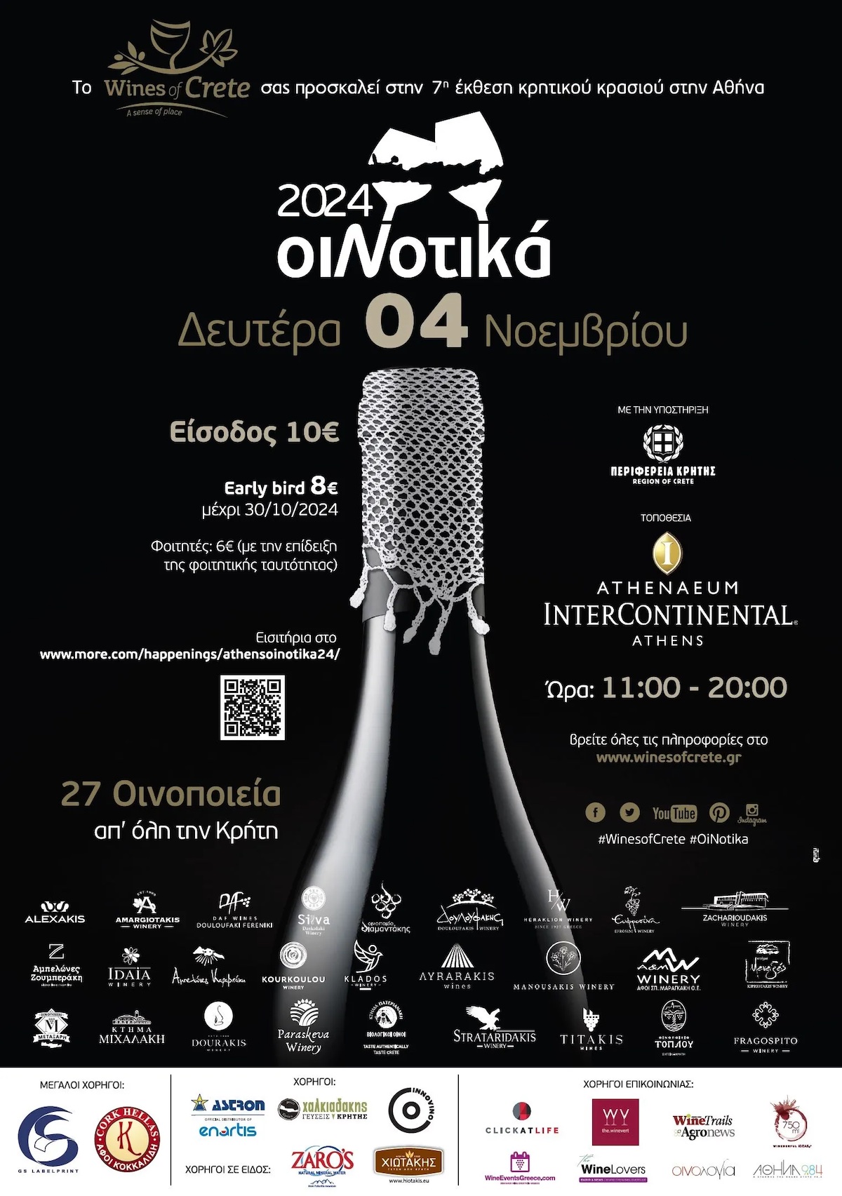 Η οινική Κρήτη με την υποστήριξη της Περιφέρειας Κρήτης, ταξιδεύει και φέτος στην Αθήνα με 11 γηγενείς ποικιλίες, 7 ζώνες ΠΟΠ, 6 ζώνες ΠΓΕ και 28 Οινοποιεία, καλωσορίζοντας τους επαγγελματίες και το οινόφιλο κοινό για γευστικές δοκιμές και οινικές συζητήσεις.