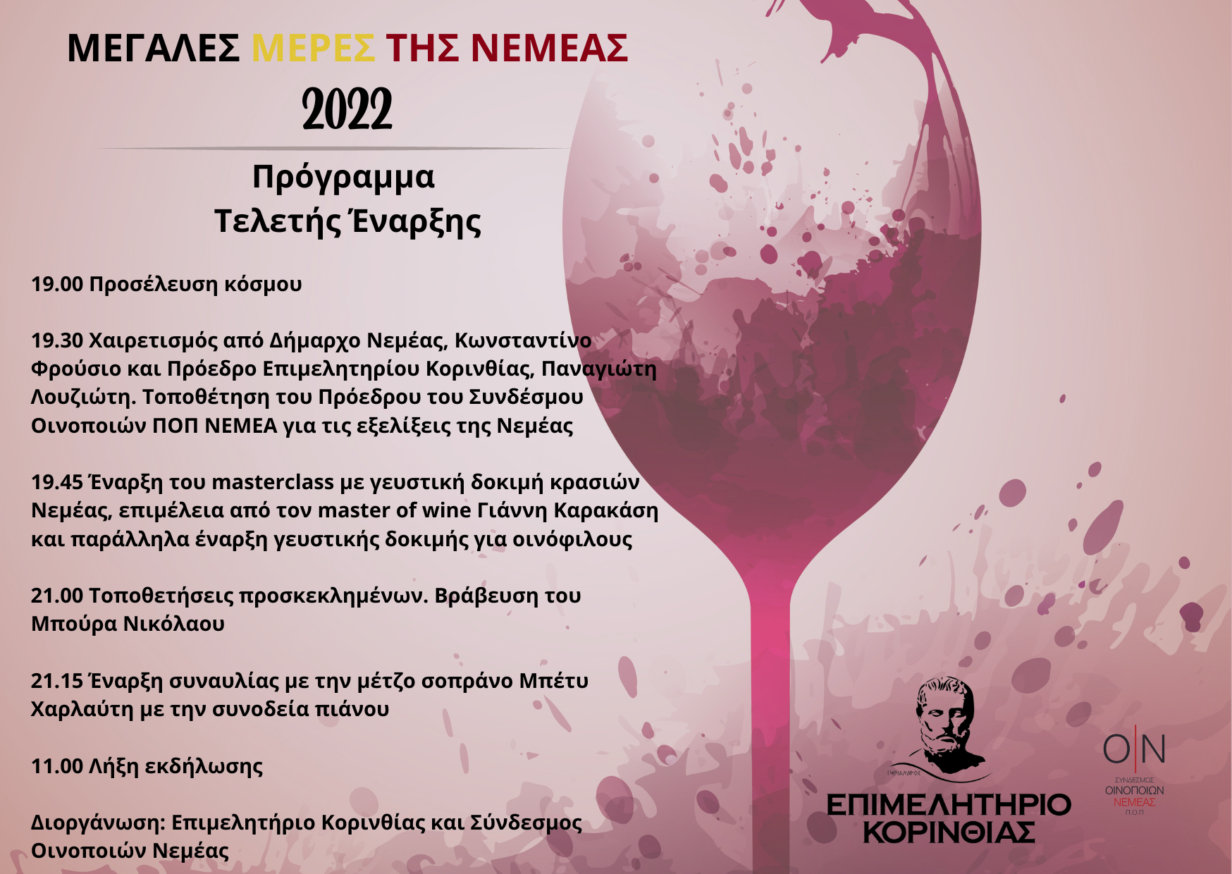 Την Παρασκευή 2 Σεπτεμβρίου 2022, στις 19:00 μ.μ. στον Αρχαιολογικό Χώρο της Αρχαίας Νεμέα θα πραγματοποιηθεί η έναρξη των Μεγάλων Ημερών της Νεμέας που συνδιοργανώνουν το Επιμελητήριο Κορινθίας, ο Σύνδεσμος Οινοποιών Νεμέας, o Δήμος Νεμέας και ο ΑΟΣ Νεμεάς.