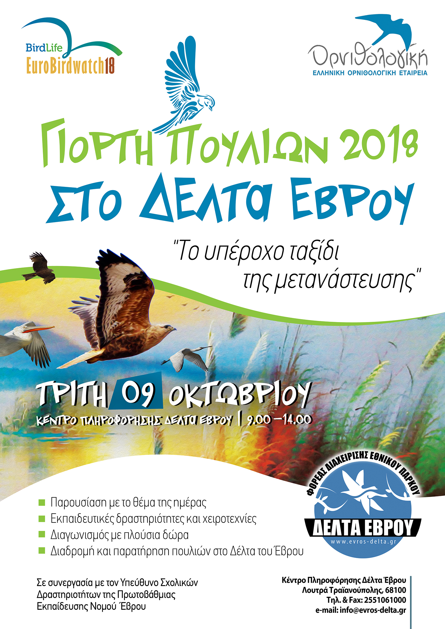 Ο Φορέας Διαχείρισης Προστατευόμενων Περιοχών Δέλτα Έβρου και Σαμοθράκης διοργανώνει την Τρίτη 09 Οκτωβρίου 2018 από τις 9.00 έως τις 14.00 στο Κέντρο Πληροφόρησης Δέλτα Έβρου την «Πανευρωπαϊκή Γιορτή Πουλιών», με αφορμή την 25η επέτειο της «Ευρωπαϊκής Γιορτής των Πουλιών» .