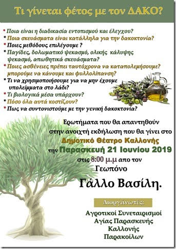 Ενημερωτική εκδήλωση για την κατάσταση που επικρατεί στον λεσβιακό ελαιώνα σχετικά με το θέμα του δάκου και την αντιμετώπισή του θα πραγματοποιηθεί την Παρασκευή  21/6 στις 8:00 το βράδυ στο δημοτικό θέατρο Καλλονής από τον γεωπόνο Βασίλη Γάλλο, υπό τη διοργάνωση των αγροτικών συνεταιρισμών Αγίας Παρασκευής, Καλλονής και Παρακοίλων.