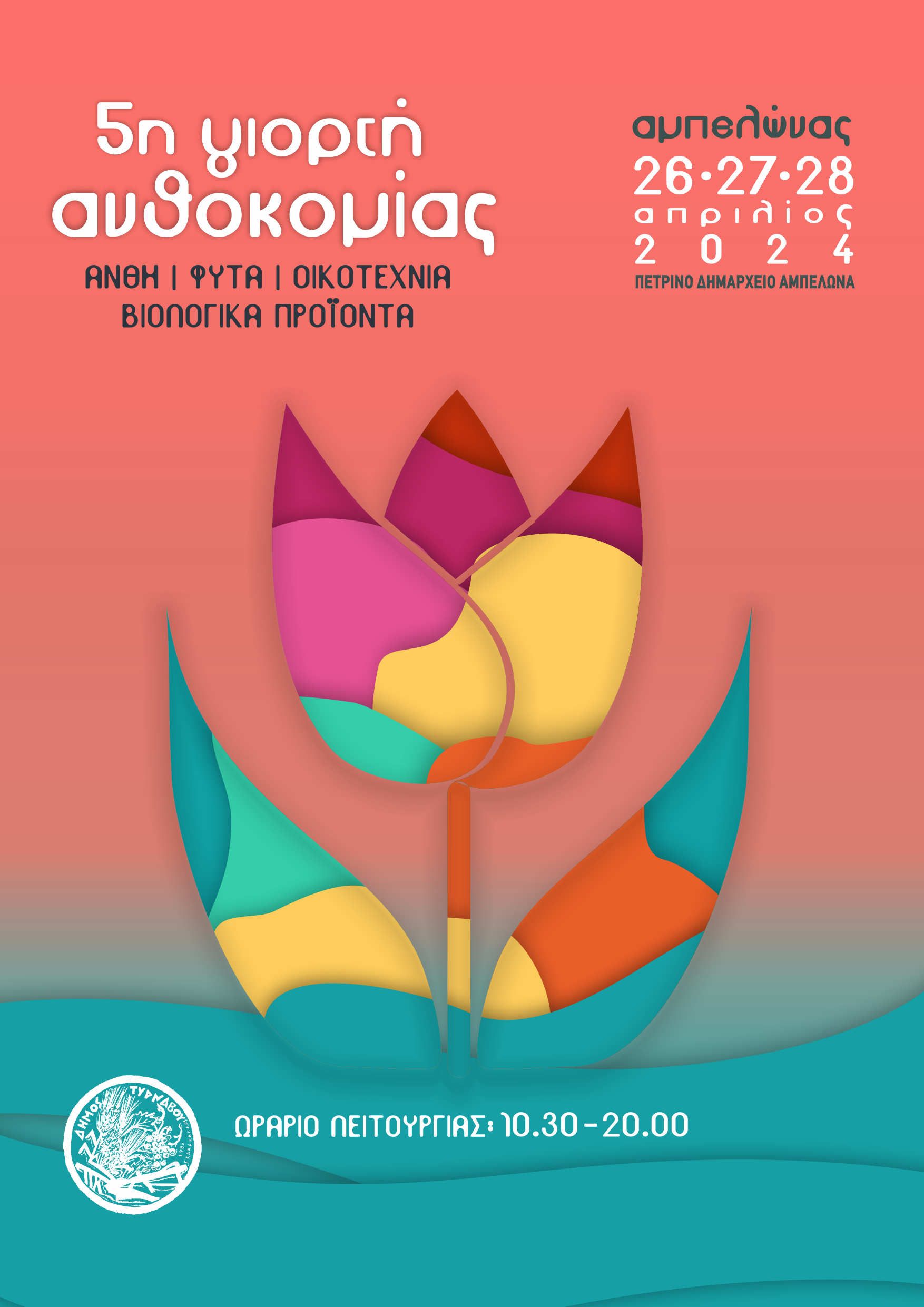Ο Δήμος Τυρνάβου διοργανώνει την 5η Γιορτή Ανθοκομίας στον Αμπελώνα στις 26, 27 και 28 Απριλίου 2024 στον χώρο έμπροσθεν του Πέτρινου Δημαρχείου Αμπελώνα.