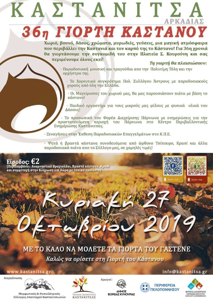 Την Κυριακή 27 Οκτωβρίου 2019, ο Μορφωτικός & Φυσιολατρικός Σύλλογος των Απανταχού Καστανιτσιωτών διοργανώνει τη Γιορτή Κάστανου και σας προσκαλεί στη μεγαλύτερη εκδήλωση του Πάρνωναπου αποτελεί πόλο έλξης χιλιάδων επισκεπτών.Στο Κέντρο Περιβαλλοντικής Ενημέρωσης Καστάνιτσας, το προσωπικό του Φορέα θα υποδεχτεί τους επισκέπτες οι οποίοι θα έχουν την ευκαιρία να ενημερωθούν για τις δράσεις και τον ρόλο του Φορέα Διαχείρισης στην προστατευόμενη περιοχή,για τα ιστορικά μνημεία της Καστάνιτσας, για την τσακώνικη διάλεκτο αλλά και να περιηγηθούν στην Έκθεση Παραδοσιακών Επαγγελμάτων. Παράλληλα στους χώρους του Κέντρουθα γίνει προβολή ταινιών – ντοκιμαντέρ σχετικά με την προστατευόμενη περιοχή Πάρνωνα – Μουστού.