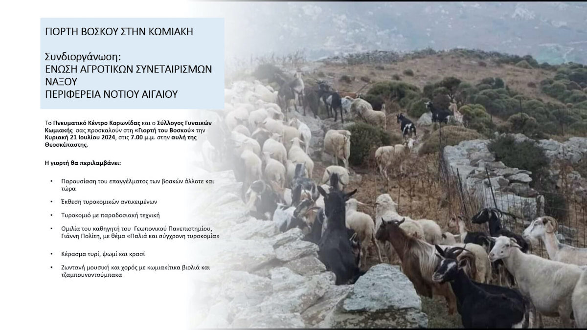 Την Κυριακή 21 Ιουλίου θα πραγματοποιηθεί, στην αυλή της Θεοσκέπαστης στην πανέμορφη Κωμιακή της Νάξου, η «Γιορτή του Βοσκού», την οποία συνδιοργανώνουν η Ένωση Αγροτικών Συνεταιρισμών Νάξου και η Περιφέρεια Νοτίου Αιγαίου!
