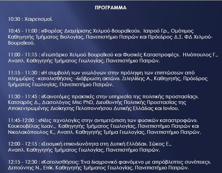Το Παράρτημα Πελοποννήσου & Δυτικής Στερεάς Ελλάδας του ΓΕΩΤ.Ε.Ε. σε συνεργασία με το Φορέα Διαχείρισης Χελμού – Βουραϊκού και το Τμήμα Γεωλογίας του Πανεπιστημίου Πατρών διοργανώνουν ημερίδα με θέμα «Διεθνής Ημέρα για τη Μείωση των Φυσικών Καταστροφών», η οποία θα πραγματοποιηθεί το Σάββατο 16 Νοεμβρίου τ.ε. (ώρα 10.30) στο ξενοδοχείο «ΒΥΖΑΝΤΙΝΟ» στην Πάτρα.