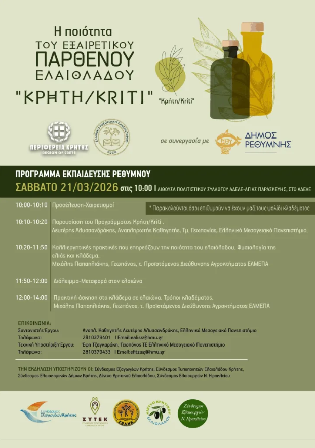 «Η ελαιοκαλλιέργεια αποτελεί βασικό πυλώνα της αγροτικής οικονομίας της Κρήτης και το ελαιόλαδο είναι από τα σημαντικότερα προϊόντα της ταυτότητας και της εξωστρέφειας του νησιού μας. Μέσα από δράσεις ενημέρωσης και εκπαίδευσης των παραγωγών, όπως η συγκεκριμένη ημερίδα, ενισχύουμε τη μεταφορά γνώσης και καλών καλλιεργητικών πρακτικών που συμβάλουν στη βελτίωση της ποιότητας του Εξαιρετικού Παρθένου Ελαιόλαδου “Κρήτη/Kriti”.