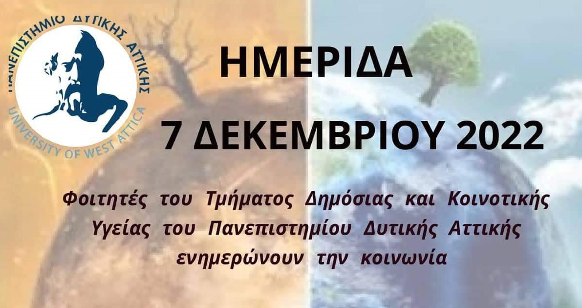 Με ανακοίνωσή τους, οι φοιτητές του Τμήματος Δημόσιας και Κοινοτικής Υγείας του Πανεπιστημίου Δυτικής Αττικής, ενημερώνουν ότι την Τετάρτη 7/12 στο Συνεδριακό Κέντρο της Σχολής Δημόσιας Διοίκησης (Λεωφόρος Αλεξάνδρας 196Α, Αθήνα), στις 15:00 μ.μ., θα πραγματοποιηθεί ημερίδα για την Κλιματική Αλλαγή, την Ασφάλεια Τροφίμων και τη Δημόσια Υγεία.