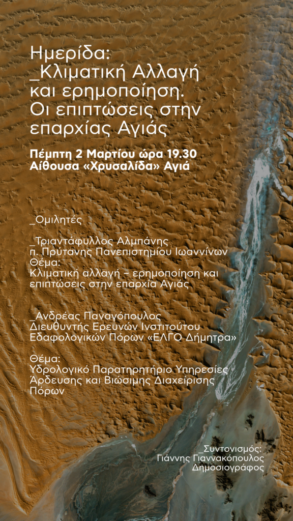 Ημερίδα σχετικά με την κλιματική Αλλαγή και ερημοποίηση της Θεσσαλίας, αλλά και τις πιθανές επιπτώσεις στην ευρύτερη περιοχή της επαρχίας Αγιάς διοργανώνει η Ενεργειακή Κοινότητα «Ισχύς Κισσάβου» σε συνεργασία με το Δήμο Αγιάς την προσεχή Πέμπτη 2 Μαρτίου στις 19.30 το απόγευμα στην αίθουσα εκδηλώσεων «Χρυσαλίδα».