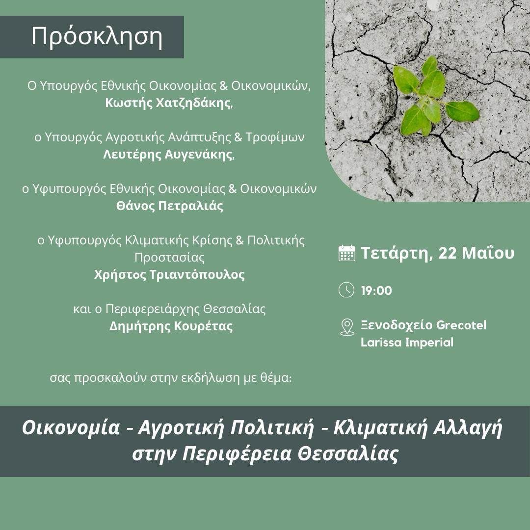 Eκδήλωση με θέμα «Οικονομία – Αγροτική Πολιτική- Κλιματική Αλλαγή στην Περιφέρεια Θεσσαλίας» θα πραγματοποιηθεί, την Τετάρτη 22 Μαΐου, στο ξενοδοχείο «Larissa Imperial”, στις 19.00 μ.μ.