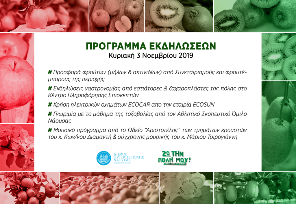 Εκδηλώσεις για την ανάδειξη προϊόντων αγροτικής παραγωγής, με θέμα «Mήλο και ακτινίδιο: γευόμαστε τα φρούτα της γης μας» διοργανώνει, την Κυριακή 3 Νοεμβρίου, ο Δήμος Νάουσας στο πλαίσιο της δράσης «Ζω την πόλη μου – Ημέρα χωρίς αυτοκίνητο», που έχει καθιερωθεί με πρωτοβουλία του Δημάρχου Νάουσας Νκόλα Καρανικόλα, κάθε πρώτη Κυριακή του μήνα. Οι εκδηλώσεις θα πραγματοποιηθούν στο Κέντρο Πληροφόρησης Επισκεπτών από τις 10:30 π.μ. έως τις 15:00 π.μ.