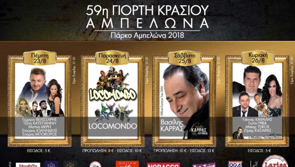 Το πρόγραμμα της 59ης Γιορτής Κρασιού που θα πραγματοποιηθεί στον Αμπελώνα Λάρισας (δήμος Τυρνάβου) από την Παρασκευή 24/8 έως την Κυριακή 26/8 ανακοινώθηκε και περιλαμβάνει: