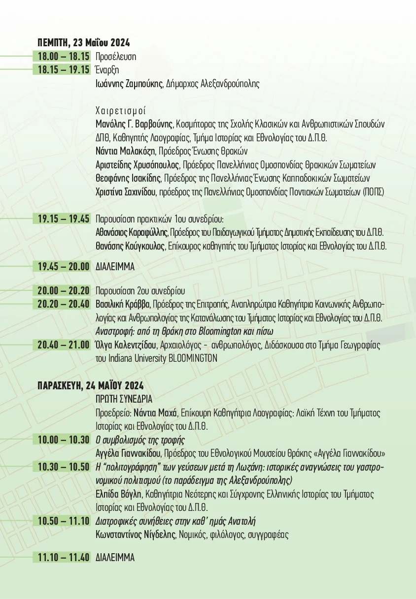 Οι επιστημονικές ανακοινώσεις θα κλείσουν το Σάββατο το πρωί στις 25 Μαΐου 2024 γύρω από ένα τραπέζι γεύσεων για το οποίο εργάστηκαν από κοινού, για τους σκοπούς του συνεδρίου, μέλη συλλόγων και μαθητές της Επαγγελματικής Σχολής Μαθητείας Αλεξανδρούπολης της Δημόσιας Υπηρεσίας Απασχόλησης (ΔΥΠΑ), με την υποστήριξη του Δήμου Αλεξανδρούπολης.