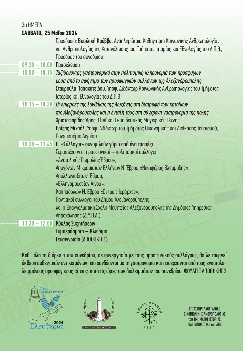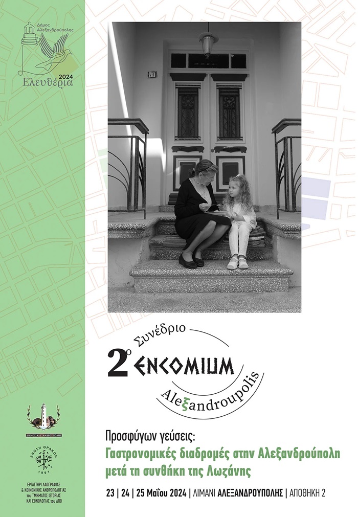 Στο πλαίσιο των ΕΛΕΥΘΕΡΙΩΝ 2024, η Ένωση Θρακών και το Εργαστήριο Λαογραφίας και Κοινωνικής Ανθρωπολογίας του Τμήματος Ιστορίας. Εθνολογίας του ΔΠΘ και τον Δήμο Αλεξανδρούπολης συνδιοργνώνουν το επιστημονικό συνέδριο “Προσφύγων γεύσεις: Γαστρονομικές διαδρομές στην Αλεξανδρούπολη μετά τη συνθήκη της Λωζάνης” που θα πραγματοποιηθεί από το απόγευμα της Πέμπτης 23 Μάϊου έως και το Σάββατο το μεσημέρι 25 Μάϊου 2024, στην αποθήκη νο2 στο λιμάνι.