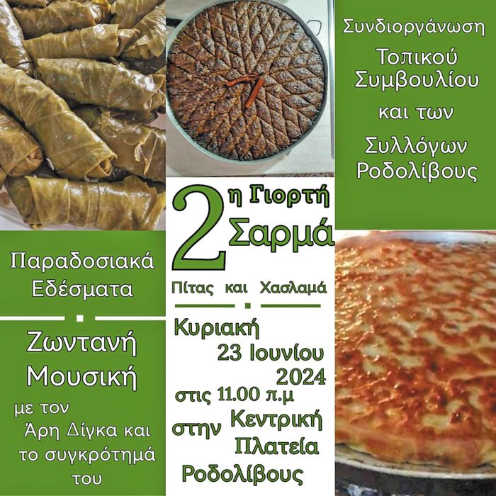 Εκτός του σαρμά, εξέχουσα θέση κατέχει το γλυκό χασλαμάς. Ένα εύκολο έδεσμα με υλικά που βρίσκονται σε κάθε σπίτι. «Ο χασλαμάς φτιάχνεται με αλεύρι, λάδι, νερό και ζάχαρη. Είναι τοπικό γλυκό από τα παλιά χρόνια, όταν υπήρχε φτώχεια, αλλά και όταν οι πρόγονοί μας δεν είχαν υλικά να φτιάξουν άλλα γλυκά οπότε έκαναν χασλαμά για λόγους οικονομίας», καταλήγει η κα Γεωργιτζίκη. Η γιορτή θα πραγματοποιηθεί μεθαύριο Κυριακή 23 Ιουνίου από τις 11.00 το πρωί στην κεντρική πλατεία του Ροδολίβους και όπως σε κάθε παραδοσιακή γιορτή ο άρτος θα συνοδεύεται με θέαμα και «ζωντανές» μουσικές.