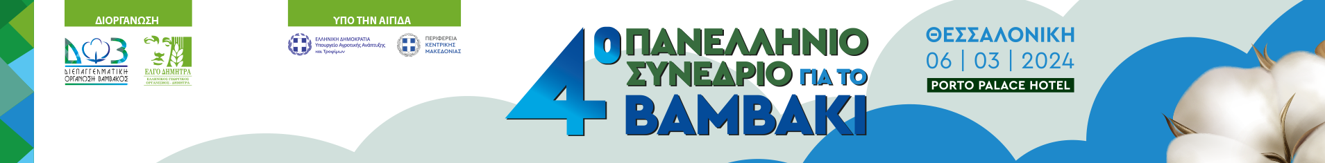 Η Διεπαγγελματική Οργάνωση Βάμβακος, σε συνεργασία με τον ΕΛΓΟ ΔΗΜΗΤΡΑ, διοργανώνουν το «4ο Πανελλήνιο Συνέδριο για το Βαμβάκι», την Τετάρτη 6 Μαρτίου 2024 και ώρα έναρξης 09:30, στο Ξενοδοχείο Porto Palace στη Θεσσαλονίκη, υπό την αιγίδα του Υπουργείου Αγροτικής Ανάπτυξης και Τροφίμων και της Περιφέρειας Κεντρικής Μακεδονίας.