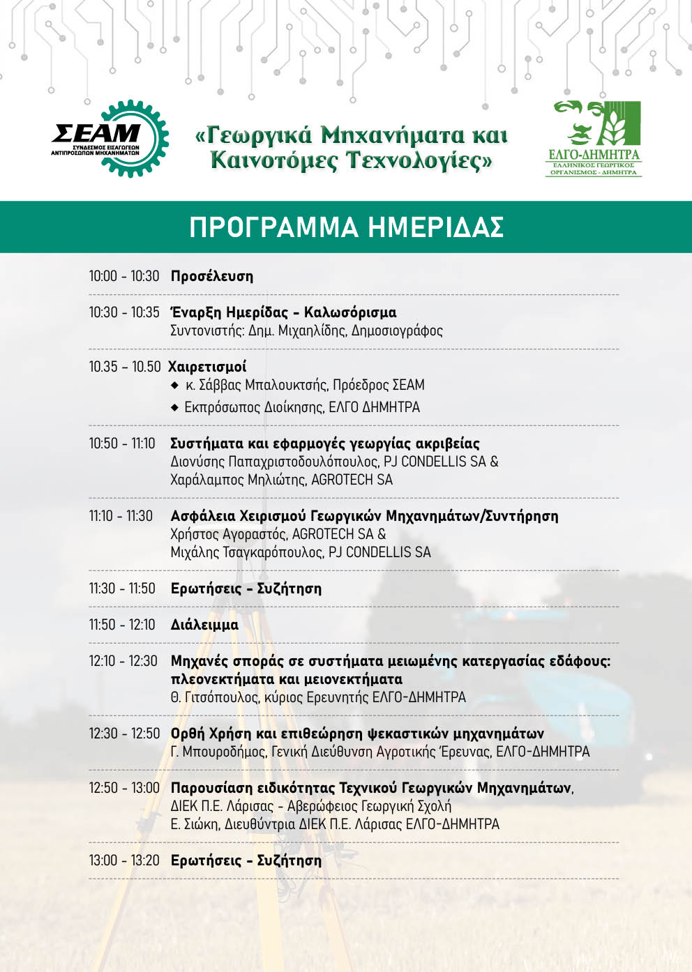Ο Σύνδεσμός Εισαγωγέων Αντιπροσώπων Μηχανημάτων (ΣΕΑΜ) σε συνεργασία με τον ΕΛΓΟ – ΔΗΜΗΤΡΑ διοργανώνει μια σειρά από επιμορφωτικές ημερίδες σε μεγάλες πόλεις της Ελλάδος, ξεκινώντας από τη Θεσσαλονίκη, τη Δευτέρα 27 Νοεμβρίου 2023, στο Ινστιτούτο Γενετικής Βελτίωσης & Φυτογενετικών Πόρων (Αγρόκτημα του ΕΛΓΟ – ΔΗΜΗΤΡΑ- περιοχή Αεροδρομίου). Hellenic Agricultural Organization (ELGO-DIMITRA) · Thermi 570 01, Greece