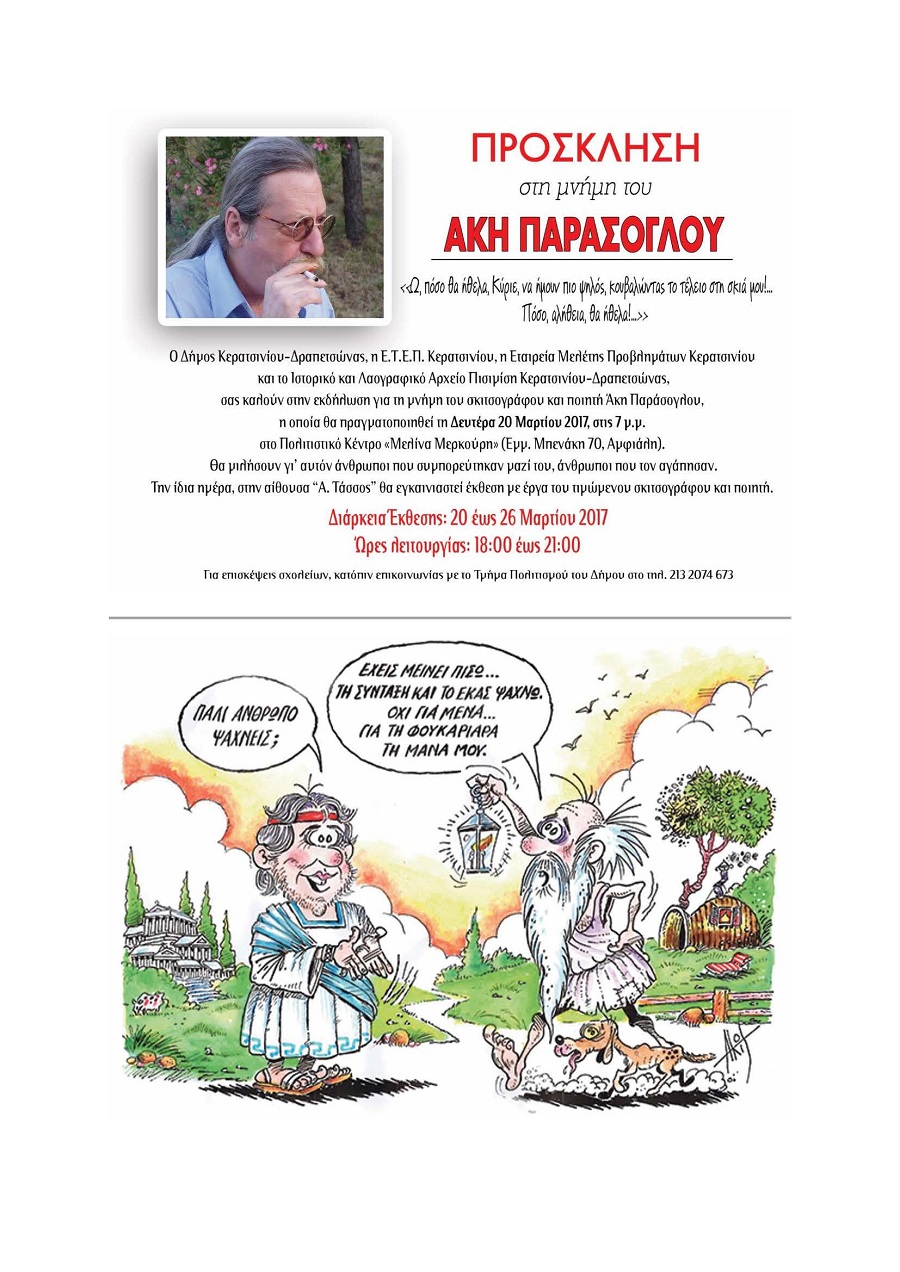 Εκδήλωση στη μνήμη του σκιτσογράφου και ποιητή Άκη Παράσογλου πραγματοποιεί την Δευτέρα 20 Μαρτίου στις 7.00 μ.μ. στο Πολιτιστικό Κέντρο «Μελίνα Μερκούρη» στην Αμφιάλη, ο δήμος Κερατσινίου – Δραπετσώνας, η ΕΤΕΠ Κερατσινίου, η Εταιρεία Μελέτης Προβλημάτων Κερατσινίου και το Ιστορικό και Λαογραφικό Αρχείο Πισιμίση Κερατσινίου – Δραπετσώνας.