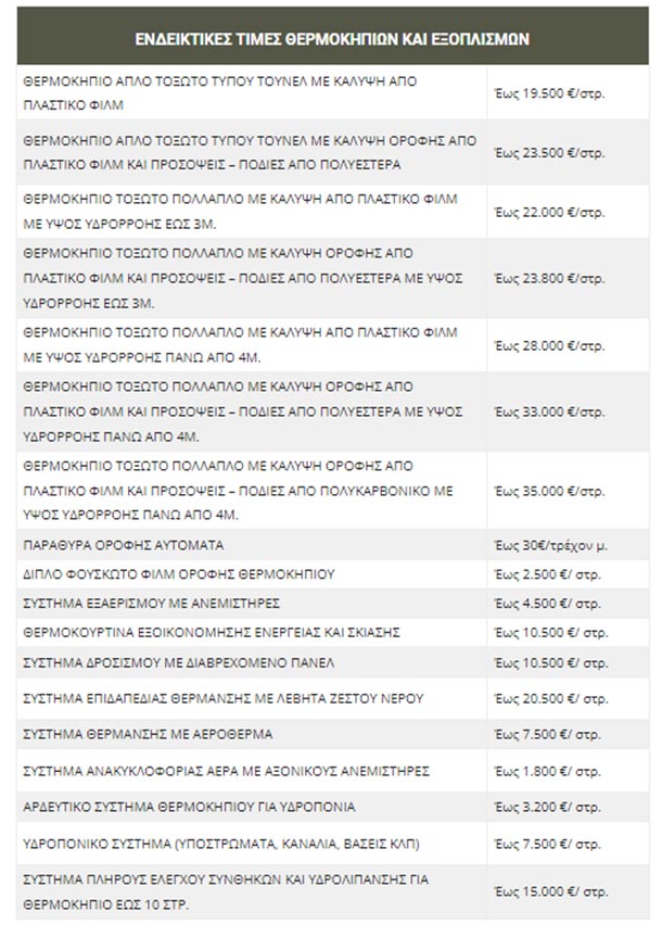 Στην ακόλουθη εικόνα παρουσιάζονται ενδεικτικές τιμές θερμοκηπίων και εξοπλισμών.