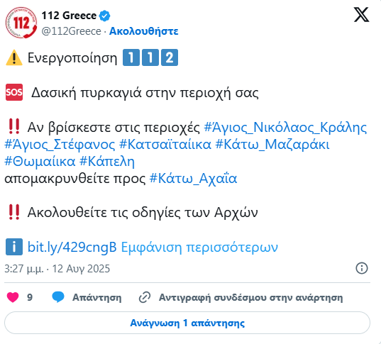 Παράλληλα, ήχησε και το 112, καλώντας τους πολίτες που βρίσκονται στην περιοχή να απομακρυνθούν προς Κερασώνα.