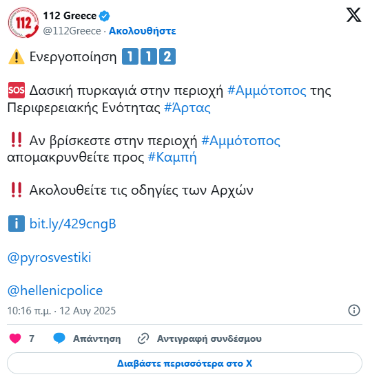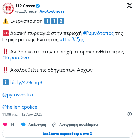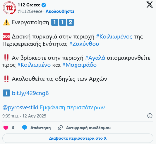 Παράλληλα, ήχησε και το 112, καλώντας τους πολίτες που βρίσκονται στην περιοχή να απομακρυνθούν προς Κερασώνα.