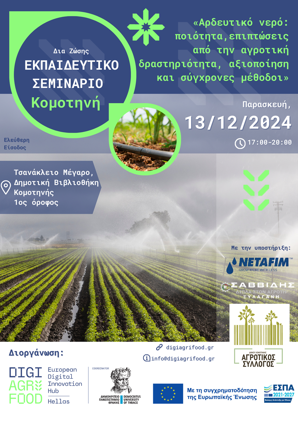 Το Δημοκρίτειο Πανεπιστήμιο Θράκης, επικεφαλής εταίρος του πρώτου Ευρωπαϊκού Κόμβου Ψηφιακής Καινοτομίας στον τομέα της Αγροδιατροφής στην Ελλάδα, #DigiAgriFood και το Εργαστήριο Υγειονομικής Μηχανικής, Ποιότητας Νερού και Αποβλήτων, του Τμήματος Πολιτικών Μηχανικών, διοργανώνουν ανοιχτό εκπαιδευτικό Σεμινάριο με θέμα: