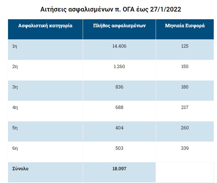 Στους 1.260 ανέρχονταν οι ασφαλισμένοι που επέλεξαν την 2η ασφαλιστική κατηγορία (εισφορά 150 ευρώ/μήνα από 147 ευρώ πέρυσι) ενώ 836 επέλεξαν την 3η (εισφορά 180 ευρώ από 177), 688 την 4η (εισφορά 217 ευρώ από 212), 404 την 5η (εισφορά260 ευρώ από 254 ευρώ) και 503 ασφαλισμένοι την 6η κατηγορία (εισφορά 339 ευρώ από 332 πέρυσι).