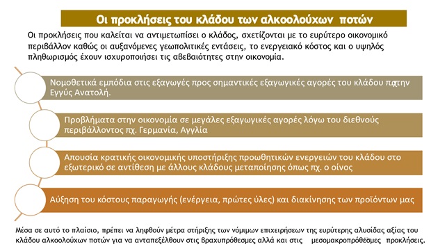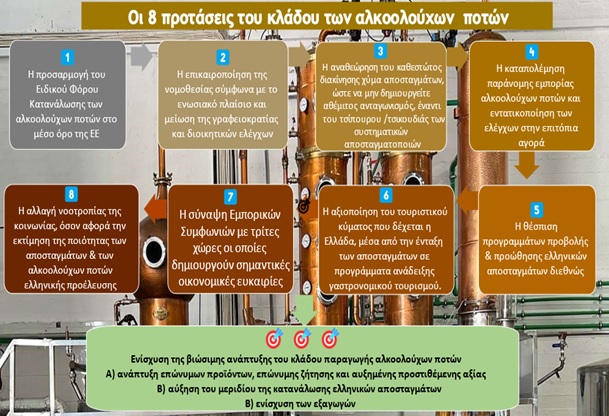 Πρέπει να ληφθούν άμεσα μέτρα στήριξης της εξωστρέφειας του κλάδου της ελληνικής παραγωγής αποσταγμάτων, που θα λαμβάνουν υπόψη τις πραγματικές του ανάγκες, για να μπορέσει ανταπεξέλθει στις βραχυπρόθεσμες και μεσομακροπρόθεσμες προκλήσεις :