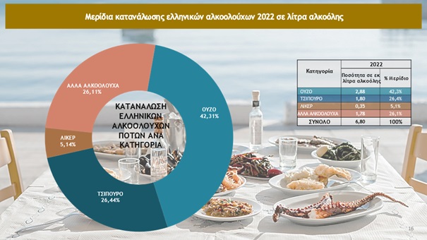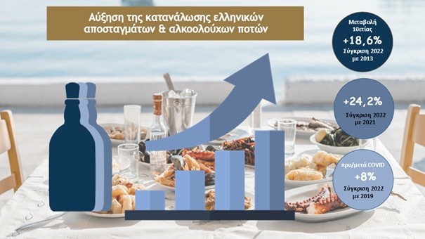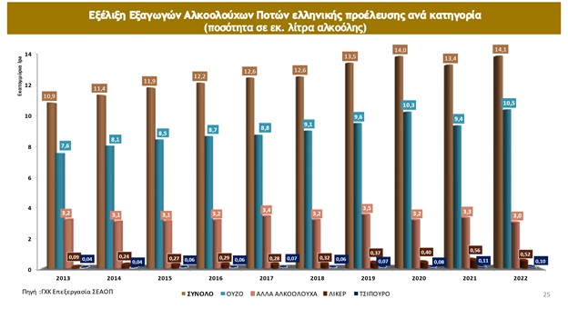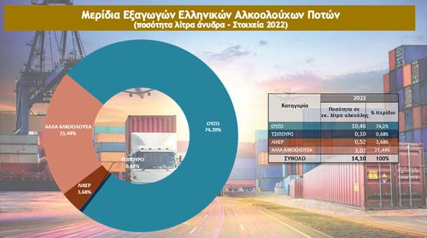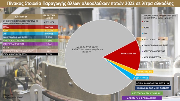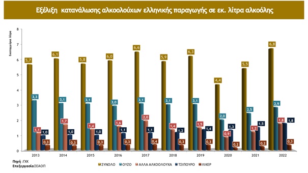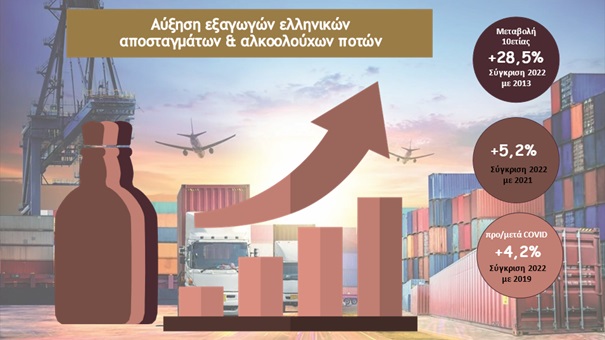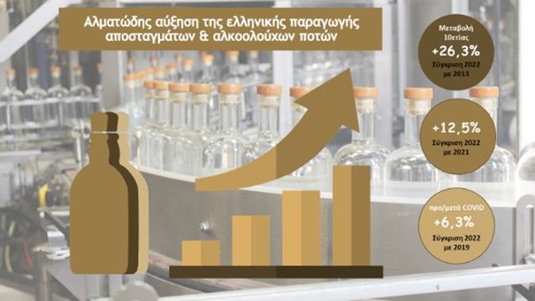 Το 2022 εξελίχθηκε σε μία εξαιρετική χρονιά για τον κλάδο της ελληνικής παραγωγής αλκοολούχων ποτών και αποσταγμάτων, καταγράφοντας σημαντικές αυξήσεις (σε επίπεδο όγκου) τόσο στην παραγωγή +12,5% και στην κατανάλωση +24,2% αλλά και στις εξαγωγές +5,2% που έχουν μια συνεχή ανοδική πορεία, επιβεβαιώνοντας την εξαιρετική ποιότητα των Ελληνικών αλκοολούχων ποτών και αποσταγμάτων.