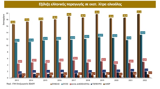 Ειδικά το 2022, η εγχώρια παραγωγή αποσταγμάτων και άλλων αλκοολούχων ποτών παρουσίασε αύξηση +12,5% σε σύγκριση με το 2021και διαμορφώθηκε στα 21,2 εκ. λίτρα αλκοόλης (+2,3 εκ. λίτρα αλκοόλης)