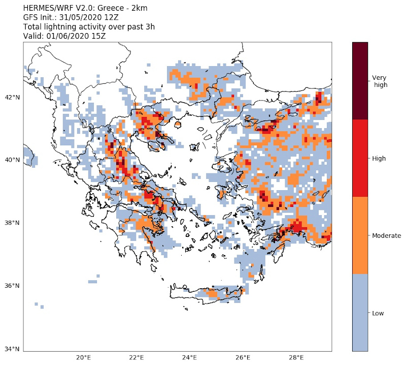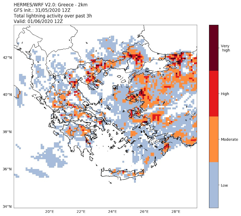 Οι καταιγίδες θα είναι κατά τόπους ισχυρές και θα συνοδεύονται από ενισχυμένους ριπαίους ανέμους και έντονη κεραυνική δραστηριότητα. Στους σχετικούς χάρτες απεικονίζεται η ισχύς της κεραυνικής δραστηριότητας που αναμένεται το μεσημέρι και το απόγευμα της Δευτέρας 01/06.