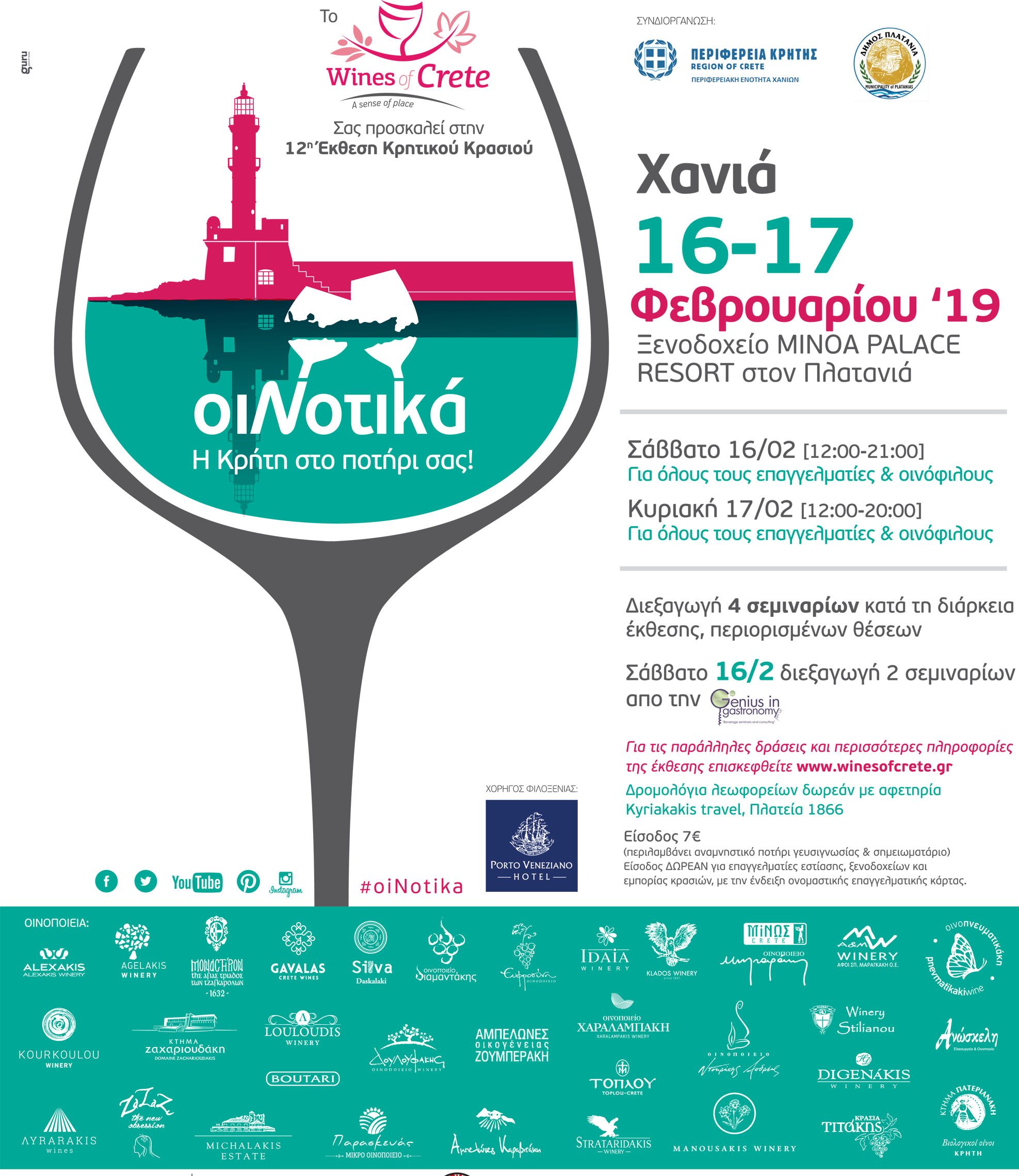 Το Δίκτυο Οινοποιών Κρήτης – Wines of Crete διοργανώνει την 12η έκθεση Κρητικού Κρασιού, ΟιΝοτικά 16 & 17 Φεβρουαρίου που θα πραγματοποιηθεί και την φετινή χρονιά στο ξενοδοχείο Minoa Palace Resort στον Πλατανιά, με την συνδιοργάνωση της Περιφέρειας Κρήτης – Περιφερειακή Ενότητα Χανίων και του Δήμου Πλατανιά.