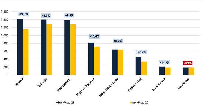 Γράφημα 1. Μεταβολή κυριότερων κλάδων, χωρίς πετρελαιοειδή, Ιανουάριος-Μάρτιος 2020/2021