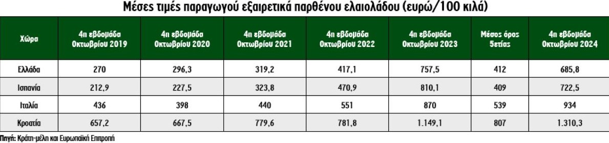 Τη μείωση των τιμών παραγωγού στο εξαιρετικά παρθένο ελαιόλαδο στην Ισπανία και στην Ελλάδα και την αύξηση στην Ιταλία καταδεικνύουν τα στοιχεία, που δημοσίευσε στις 4 Νοεμβρίου η Ευρωπαϊκή Επιτροπή για την 4η εβδομάδα του Οκτωβρίου, που είναι και η 4η εβδομάδα της ελαιοκομικής περιόδου 2024/2025.