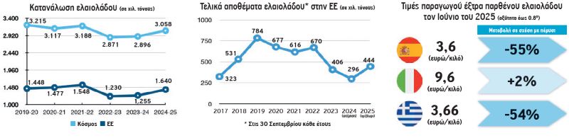 Το σκηνικό δεν άλλαξε στις επιμέρους παραγωγές ανά ευρωπαϊκή χώρα. Απλά επιβεβαιώνονται τα στοιχεία που είχαμε από τις αρχές του 2025. Έτσι, συνολικά στην ΕΕ η αύξηση της παραγωγής έφτασε το 36% σε έναν χρόνο – σύγκριση μεταξύ 2023/24 και 2024/25. Αντίστοιχα, στην Πορτογαλία, είχαμε αύξηση κατά 10%, στην Ελλάδα κατά 30% και στην Ισπανία κατά 66%. Αντίθετα, στην Ιταλία είχαμε μείωση κατά 24%.