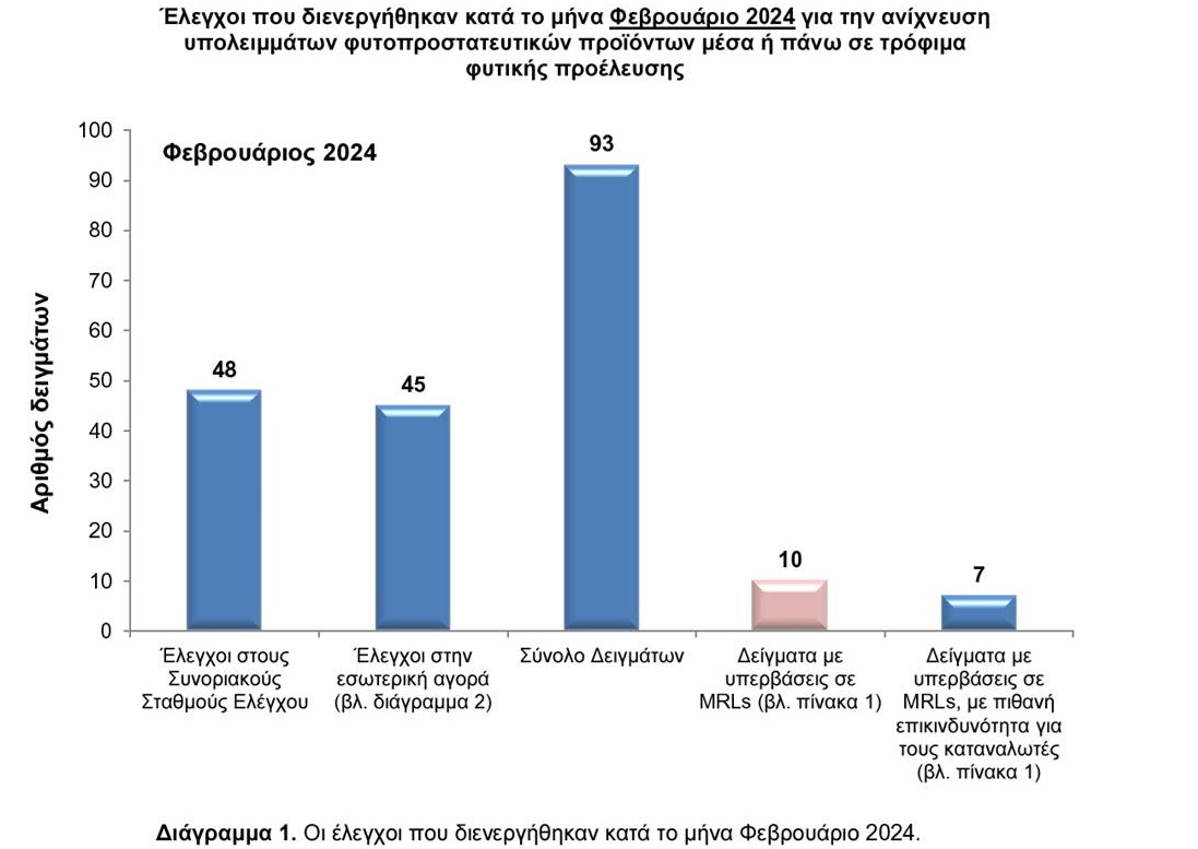 Δέκα συνολικά υπερβάσεις των επιτρεπόμενων ορίων υπολειμμάτων φυτοφαρμάκων (MRL) σε τρόφιμα φυτικής προέλευσης ανιχνεύτηκαν κατά την τακτική διενέργεια ελέγχων των αρμόδιων υπηρεσιών του ΥΠΑΑΤ τον Φεβρουάριο του 2024, σύμφωνα με τα στοιχεία που ανάρτησε η Διεύθυνση Προστασίας Φυτικής Παραγωγής στην ιστοσελίδα του υπουργείου. Εφτά από τις υπερβάσεις αφορούσαν, μάλιστα, φορτία που απορρίφθηκαν καθώς εντοπίστηκε υπέρβαση των ορίων σε βαθμό πιθανής επικινδυνότητας για τον καταναλωτή.
