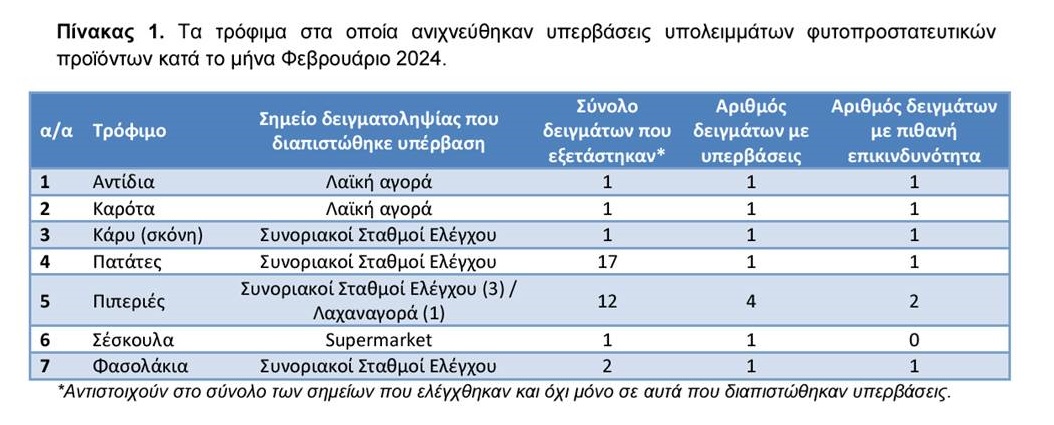 Ακτινίδια, καρότα, κάρυ (σκόνη), πατάτες, πιπεριές, σέσκουλα, φασολάκια αποτέλεσαν τα τρόφιμα στα οποία ανιχνεύτηκαν υπερβάσεις υπολειμμάτων φυτοπροστατευτικών προϊόντων για τον εξεταζόμενο μήνα με όλα τα προαναφερθέντα προϊόντα να έχουν από ένα δείγμα με υπολειμματικότητα εκτός των επιτρεπόμενων ορίων ενώ οι πιπεριές είχαν τέσσερις. Όσον αφορά τον αριθμό των δειγμάτων με πιθανή επικινδυνότητα τα ακτινίδια, τα καρότα, το κάρυ (σκόνη), οι πατάτες και τα φασολάκια είχαν από ένα δείγμα ενώ στις πιπεριές ανιχνεύθηκαν δύο δείγματα με πιθανή επικινδυνότητα.