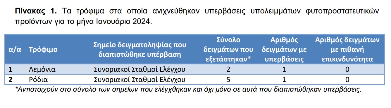 Λεμόνια και ρόδια αποτέλεσαν τα τρόφιμα στα οποία ανιχνεύτηκαν υπερβάσεις υπολειμμάτων φυτοπροστατευτικών προϊόντων για τον εξεταζόμενο μήνα με όλα τα προαναφερθέντα προϊόντα να έχουν από ένα δείγμα με υπολειμματικότητα εκτός των επιτρεπόμενων ορίων.