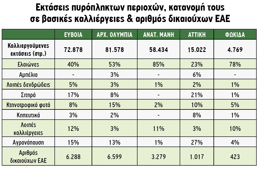 Σύμφωνα με τα διαθέσιμα στοιχεία, στις περιοχές που επλήγησαν από τις πυρκαγιές βρίσκονται 17.606 εκμεταλλεύσεις, οι παραγωγοί των οποίων λαμβάνουν Ενιαία Ενίσχυση. Στον πίνακα που παρατίθεται φαίνεται ότι η Αρχαία Ολυμπία και η Εύβοια είναι οι περιοχές με τους περισσότερους πυρόπληκτους που απασχολούνται στον πρωτογενή τομέα με 6.599 και 6.288 δικαιούχους άμεσων ενισχύσεων αντίστοιχα. Ακολουθούν η Ανατολική Μάνη με 3.279 δικαιούχους, η Αττική με 1.017 και η Φωκίδα με 423, βάσει πάντα των κοινοτήτων από τις οποίες πέρασαν οι φλόγες.