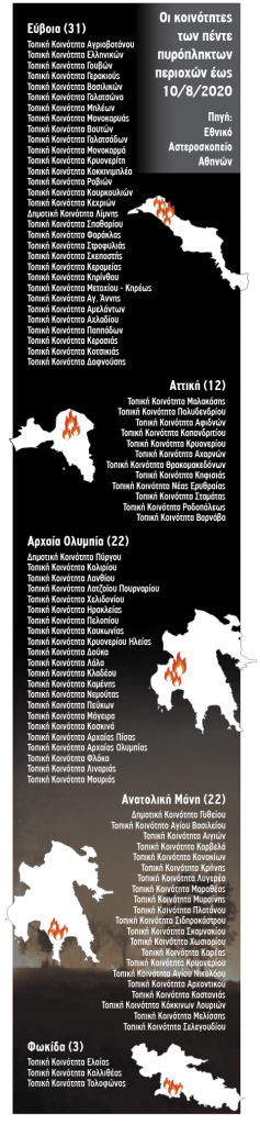 οκαριστικά είναι τα στοιχεία που συγκέντρωσε και επεξεργάστηκε η «ΥΧ» για το μέγεθος της καταστροφής που αντιμετώπισαν πέντε περιοχές της χώρας τις τελευταίες ημέρες και αφορούν τις πρόσφατες πυρκαγιές. Βάσει στοιχείων που μας παραχωρήθηκαν από το Εθνικό Αστεροσκοπείο και μέχρι τις 10 Αυγούστου, η φωτιά πέρασε από συνολικά 90 κοινότητες. Στην Εύβοια, αντιμέτωπες με τις φλόγες ήρθαν 31 κοινότητες, στην Αρχαία Ολυμπία 22 κοινότητες, στην Ανατολική Μάνη επίσης 22 κοινότητες, στην Αττική 12 κοινότητες και στη Φωκίδα 3 κοινότητες.