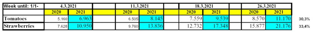 Επίσης συνεχίζεται με αυξητικούς ρυθμούς η εξαγωγή φράουλας και από 1/1 έως 26/3/2021 ανήλθαν σε 21.176 τόνους έναντι 15.877 τ. αντίστοιχα πέρισυ