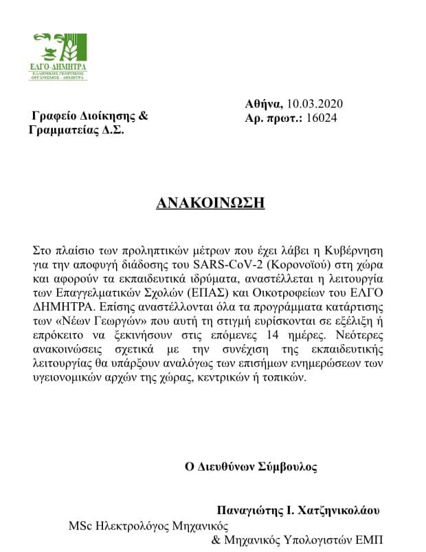 Αναστέλλονται, σύμφωνα με ανάρτηση του ΕΛΓΟ-ΔΗΜΗΤΡΑ στα μέσα κοινωνικής δικτύωσης όλα τα προγράμματα κατάρτισης Νέων Γεωργών, στο πλαίσιο των προληπτικών μέτρων που έχει λάβει η κυβέρνηση για την αποφυγή διάδοσης του Κορωνϊού. Σύμφωνα με την ανάρτηση κλειστές θα είναι και οι έξι ΕΠΑΣ του ΕΛΓΟ- ΔΗΜΗΤΡΑ.
