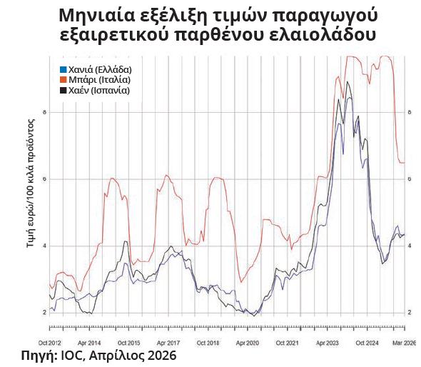 Σε ότι αφορά τις τιμές παραγωγού για το εξαιρετικό παρθένο ελαιόλαδο αυτές την εβδομάδα 16-22 Μαρτίου διαμορφώθηκαν στα 438,5 ευρώ ανά 100 κιλά προϊόντος για την Ισπανία (Χαέν), υψηλότερα κατά 14,8% από την αντίστοιχη περσινή εβδομάδα. Στην Ελλάδα (Χανιά) την ίδια εβδομάδα η τιμή ήταν στα 430 ευρώ/100 κιλά, υψηλότερα κατά 1,2% της αντίστοιχης περσινής, ενώ στην Ιταλία (Μπάρι), στα 650 ευρώ/100 κιλά, -30,1% από πέρυσι. Οι τιμές αυτές σε σύγκριση με όσα κατέγραψε το IOC ένα μήνα πριν (16-22 Φεβρουαρίου), ήταν σταθερές για τους Ιταλούς και τους Ισπανούς παραγωγούς (-0,11%), αλλά ελαφρώς χαμηλότερες για τη χώρα μας (-2,27%, από τα 440 ευρώ/100 κιλά που καταγράφονταν τον Φεβρουάριο).