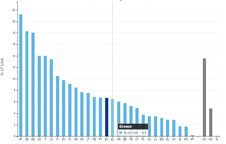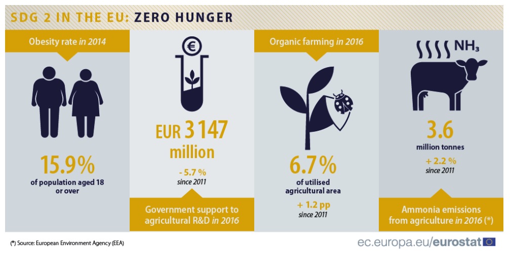 Πρωταθλητές στη λίστα είναι οι χώρες της Αυστρίας (21,25%), της Σουηδίας (18,3%) και της Εσθονίας (18%) ενώ οι τρεις ουραγοί είναι η Ιρλανδία (1,72%) η Ρουμανία (1,67%) και η Μάλτα (0,2%). Ως προς τους Ίβηρες γείτονές μας, η Ισπανία βρίσκεται σχετικά υψηλά με 8,48% ενώ η Πορτογαλία μας ξεπερνά κατά μία θέση με 6,75% . Αξίζει να σημειωθεί ότι από το 2011 έως το 2016 η επιφάνεια των γεωργικών εκτάσεων με βιολογικές καλλιέργειες αυξήθηκε πανευρωπαϊκά κατά 1,2% τη στιγμή όμως που η οικονομική ενίσχυση από τις κυβερνήσεις των 28 σε έρευνα και ανάπτυξη μειώθηκε κατά 5,7%, γεγονός αποθαρρυντικό για την επίτευξη του στόχου της αντιμετώπισης της πείνας, της κακής διατροφής καθώς και της αειφόρου γεωργίας στη γηραιά ήπειρο.