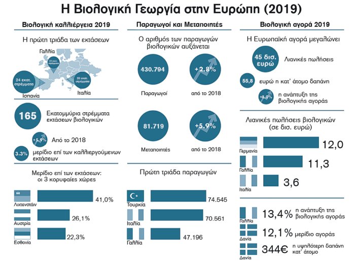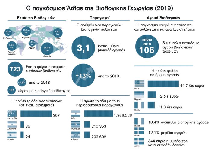 Υψηλότερα μερίδια μεταξύ των κρατών εμφανίζουν το Λιχτενστάιν (41%) και η Αυστρία (26,1%), ενώ η έρευνα εντοπίζει ακόμη 16 χώρες με μερίδια άνω του 10%. Οι παγκόσμιες βιολογικές εκτάσεις το 2019 αυξήθηκαν κατά 1,6%, ενώ η υψηλότερη απόλυτη αύξηση καταγράφηκε σε Ευρώπη (5,9%), Βόρεια Αμερική (9,1%) και Λατινική Αμερική (3,5%). Αυξημένοι κατά 12,5% από το προηγούμενο έτος, οι βιοκαλλιεργητές το 2019 ήταν τουλάχιστον 3,1 εκατομμύρια. Το 51% βρίσκεται στην Ασία, το 27% στην Αφρική, το 14% στην Ευρώπη και το 7% στη Λατινική Αμερική. Οι παγκόσμιες πωλήσεις βιολογικών τροφίμων και ποτών την ίδια χρονιά ξεπέρασαν τα 106 δισ. ευρώ. Οι χώρες με τα υψηλότερα μερίδια βιολογικών αγορών ήταν οι ΗΠΑ (44,7 δισ. ευρώ), η Γερμανία (12 δισ. ευρώ) και η Γαλλία (11,3 δισ. ευρώ), με αυτήν της ΕΕ να ανέρχεται σε 41,4 δισ. ευρώ και το 39% της παγκόσμιας.