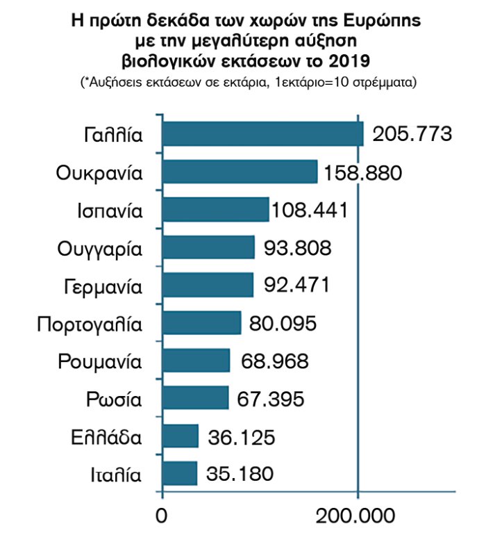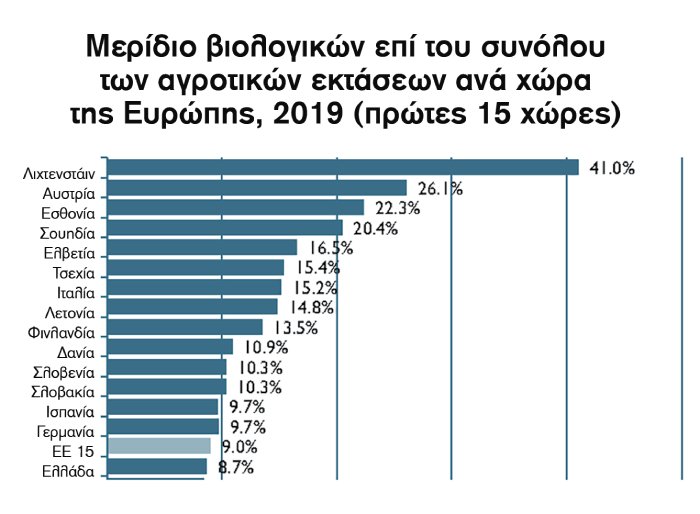 Επί ευρωπαϊκού εδάφους, σε ό,τι αφορά τον φιλόδοξο στόχο αύξησης των βιολογικών εκτάσεων, ήδη Λιχτενστάιν και Αυστρία τον ξεπέρασαν (41% και 26,1% αντίστοιχα), ενώ Εσθονία και Σουηδία τον πλησιάζουν (22,3% και 20,4% αντίστοιχα). Όσον αφορά την Ελλάδα, με 5,28 εκατ. στρέμματα βιολογικής γης, η χώρα φιγουράρει στην ένατη θέση στη λίστα χωρών της Ευρώπης, συμπεριλαμβανομένων κρατών, όπως η Ρωσία και η Τουρκία, συγκεντρώνοντας ένα μερίδιο βιολογικών 8,7%.