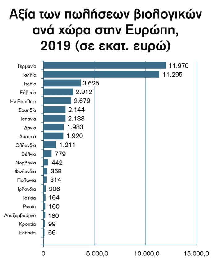 Σε όρους αγοράς, Ευρώπη αλλά και ΕΕ υπερδιπλασίασαν την αξία των βιολογικών τους πωλήσεων από το 2010 στο 2019, με την υψηλότερη ανάπτυξη την τελευταία χρονιά να παρατηρείται στη Γαλλία, κατά 13,4%, αλλά και τη Γερμανία να παραμένει η μεγαλύτερη αγορά βιολογικών της Ευρώπης και δεύτερη παγκοσμίως, με 11,97 δισ. ευρώ λιανικών πωλήσεων. Η χώρα μας, με στοιχεία του 2017, απείχε αρκετά από τις πρώτες θέσεις, αλλά και τη λίστα των χωρών με τη μεγαλύτερη ανάπτυξη, με την αξία των λιανικών πωλήσεων βιολογικών της στα 66 εκατ. ευρώ και την κατ’ άτομο δαπάνη στα 6 ευρώ.